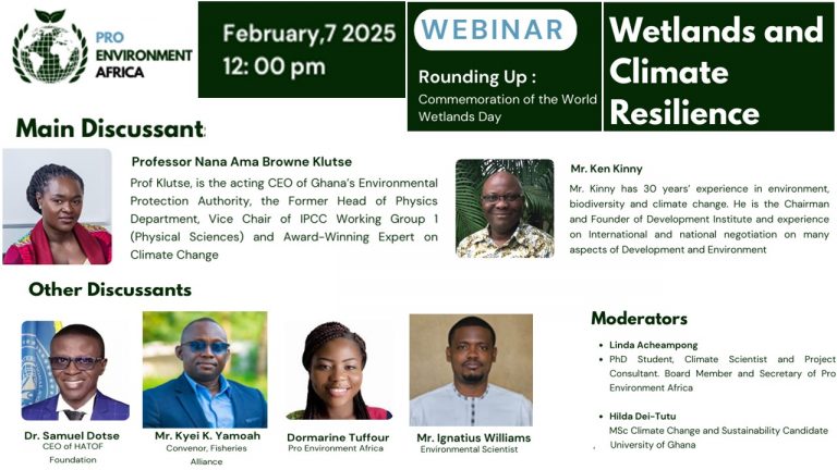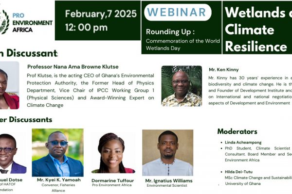 The Pro Environment Africa joined in the commemoration of the 2025 Wetlands Day and organized a Webinar on 7th February 2025 to discuss critical issues on wetlands and climate resilience. Below are the key issues discussed by the discussants: Professor Nana Ama Browne Klutse, is the acting CEO of Ghana’s Environmental Protection Authority, the Former…