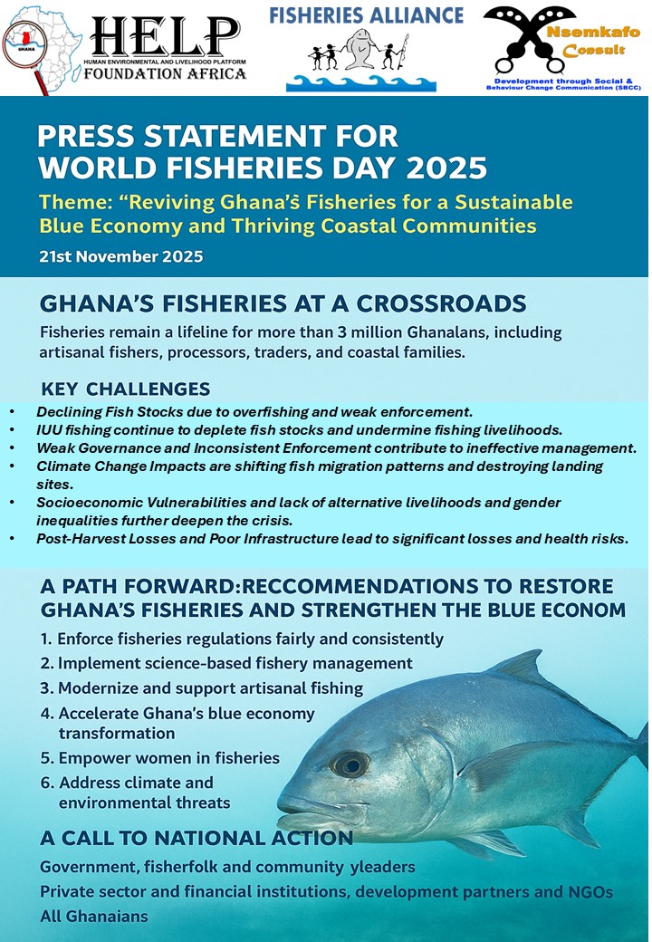By: Kwadwo Kyei Yamoah, Executive Director: HELP Foundation Africa. Convener: Fisheries Alliance / CSOs SDG 14 Platform, (+233 244817020) kkyeiyams@gmail.com. Executive Summary Ghana’s fisheries sector supports over 3 million livelihoods and provides more than 60 percent of national animal protein. Yet the sector faces a severe decline in fish stocks due to Illegal, Unreported and…